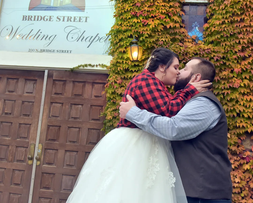 Are you looking for great wedding photography you can afford? Check out Holmes Photography Studio LLC We offer SIGNIFICANT discounted pricing for our chapel couples (and bridal show couples). The Holmes family created the Bridge Street Wedding Chapel from a historic old church that needed a lot of TLC and in doing so made it very “photographer friendly” with overhead views built in etc.