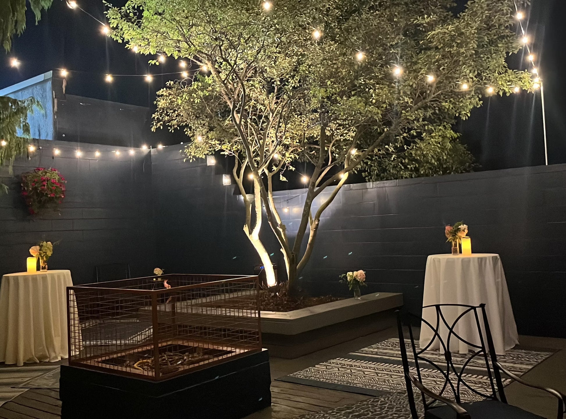 Included for FREE: Mahogany chiavari chairs with ivory comfort cushions. Floor-length linens (white, black or ivory) steamed to a crisp finish. Photo Booth with an extensive array of props. Audio guest book. Free parking. Award-winning Day of Coordination services AND Full Event Planning Services. Private courtyard with gas firepit. Custom lighting. All of these details and more are included with your booking of Copper Moon.
